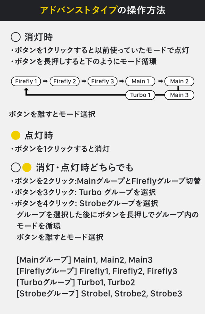 テールキャップを緩めた場合は、「ロックアウト」機能が働き、サイドボタンを押しても点灯しないモードになります。
